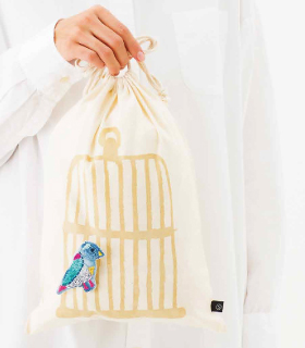 巾着につけた鳥は、鳥かごから飛び出していつでも一緒。